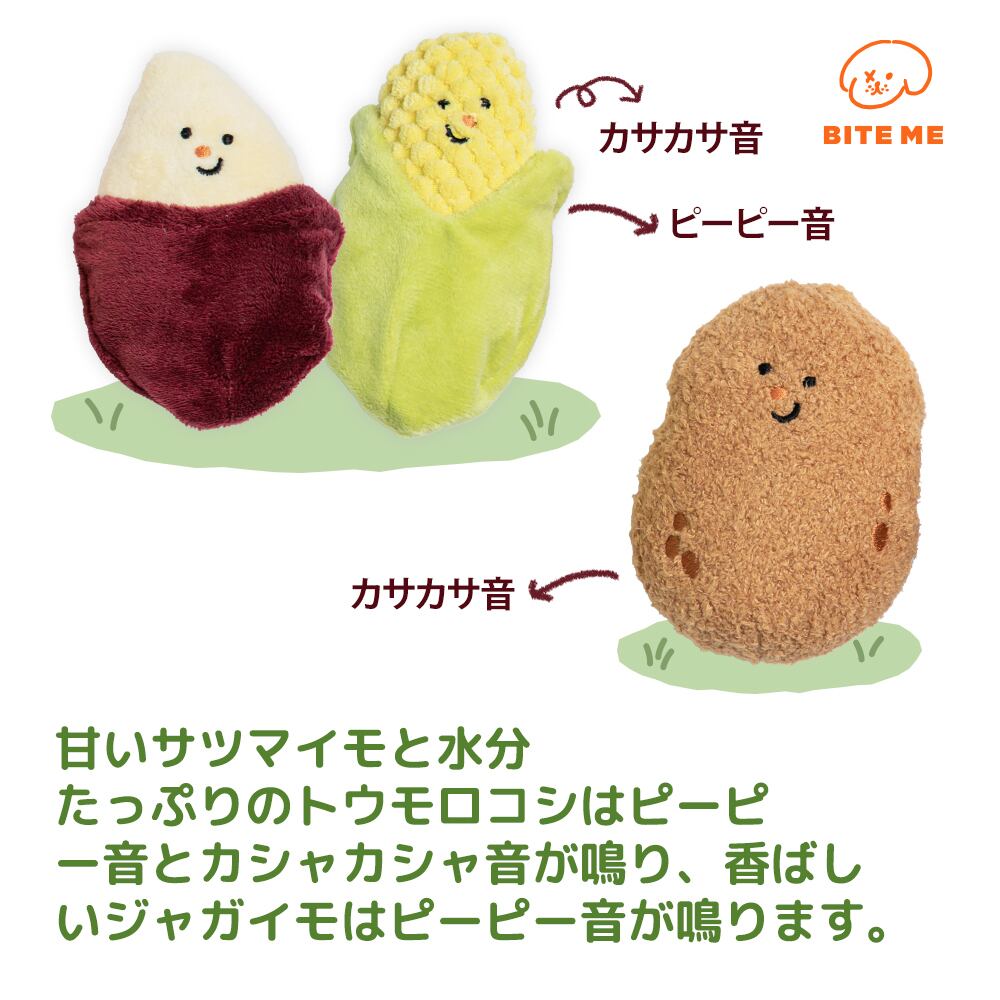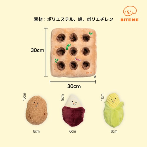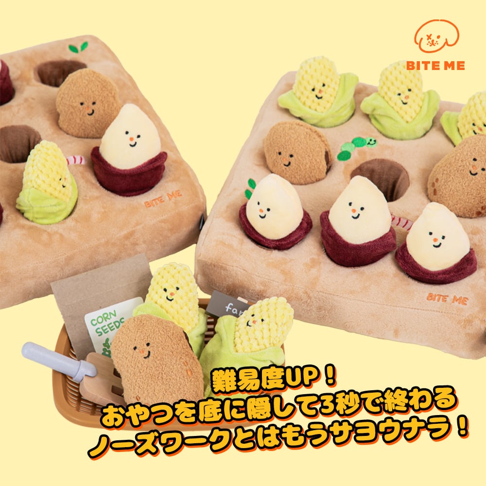難易度UP!おやつを底に隠して3秒で終わるノーズワークとはもうサヨウナラ! 野菜の中におやつを隠して、難易度の高いノーズワークを楽しんでください! 甘いサツマイモと水分たっぷりのトウモロコシはピーピー音とカシャカシャ音が鳴り、香ばしいジャガイモはピーピー音が鳴ります。 滑り止め付きで安全に、長い時間飽きることなく遊ぶことができます。