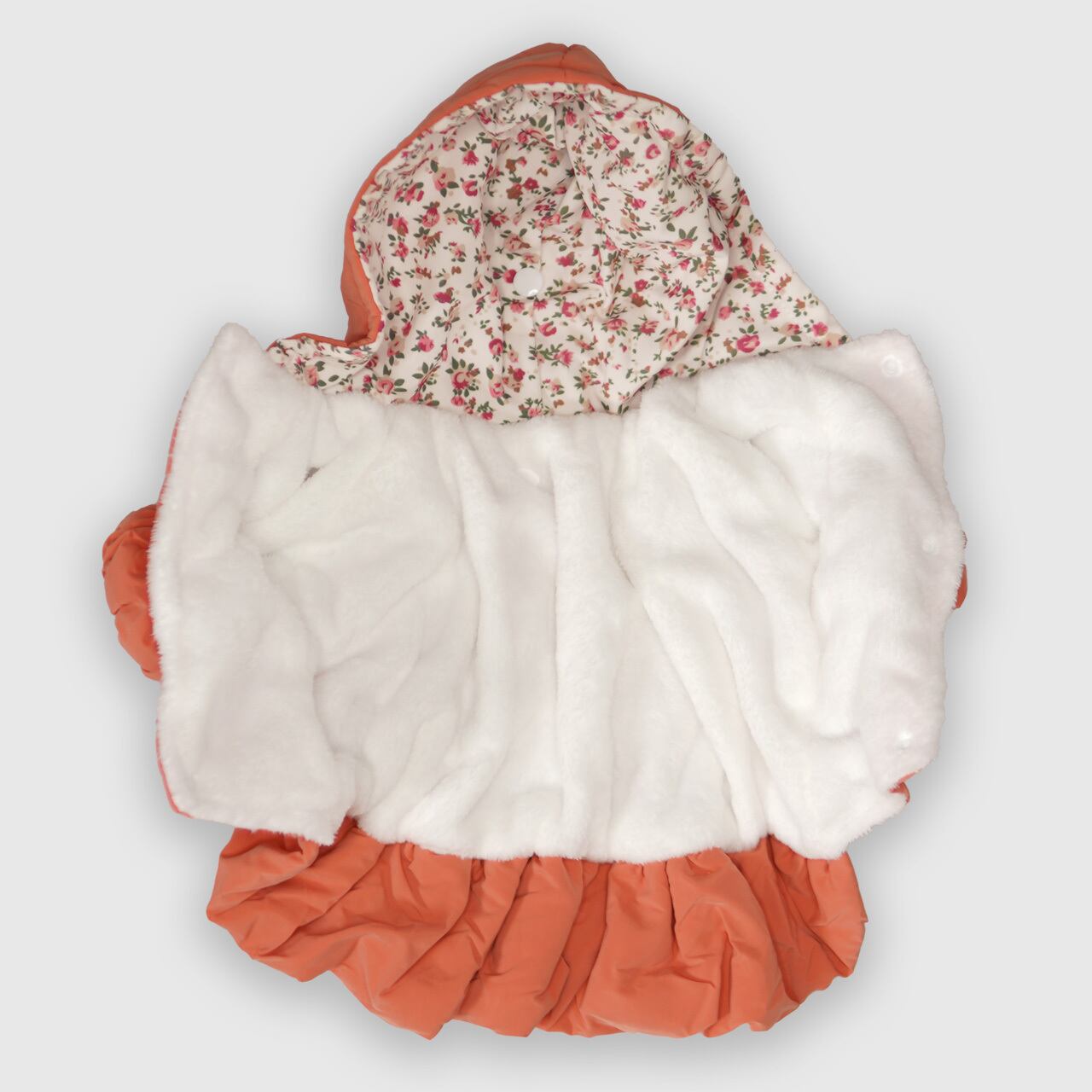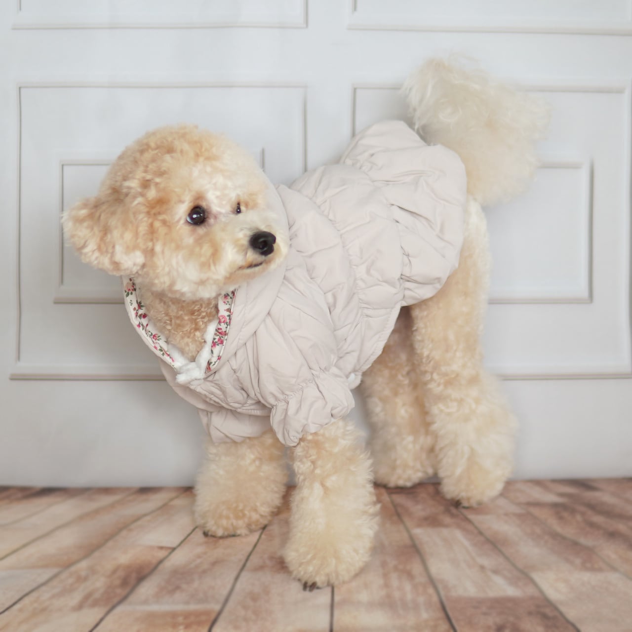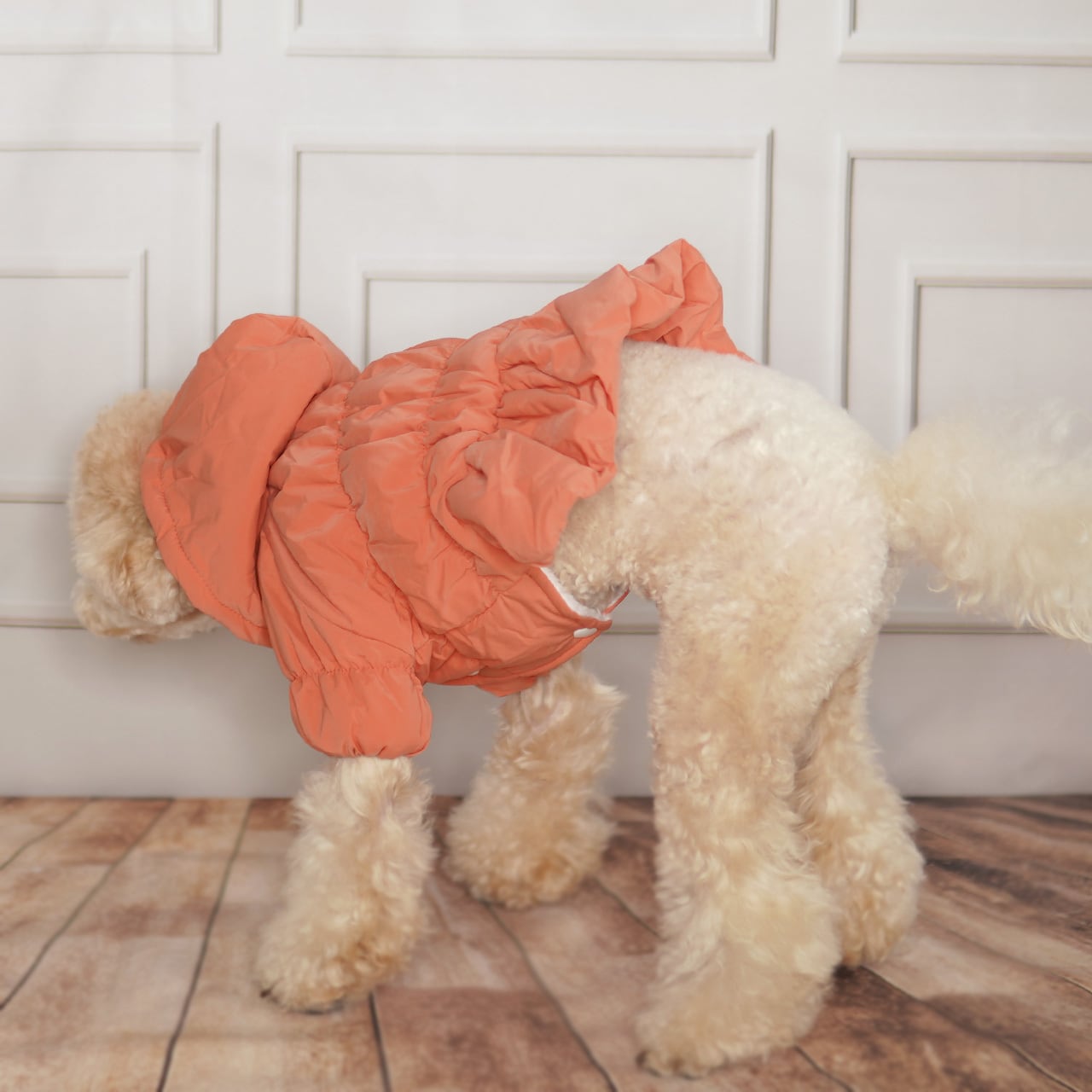寒い冬のお散歩に最適なダウンジャケット。裏地は暖かなフリース素材。柔らかく軽いのでワンちゃんもストレスなくご着用いただけます。