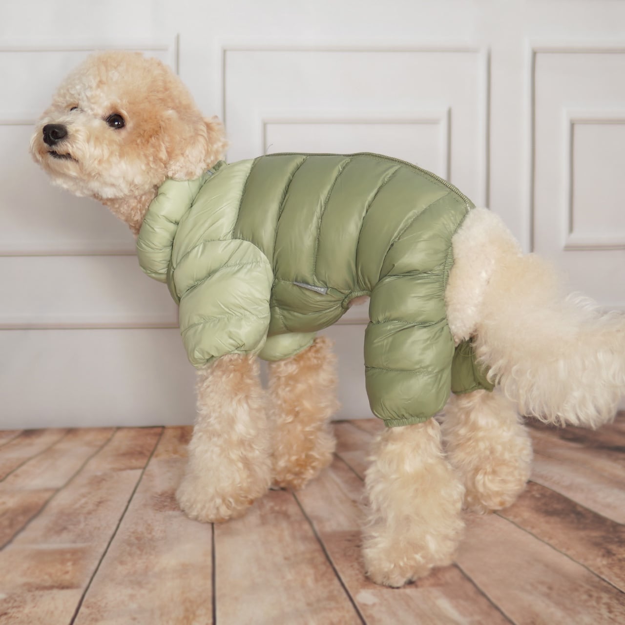 寒い冬のお散歩に最適な上質ダウンコート。とても柔らかく軽いのでワンちゃんもストレスなくご着用いただけます。